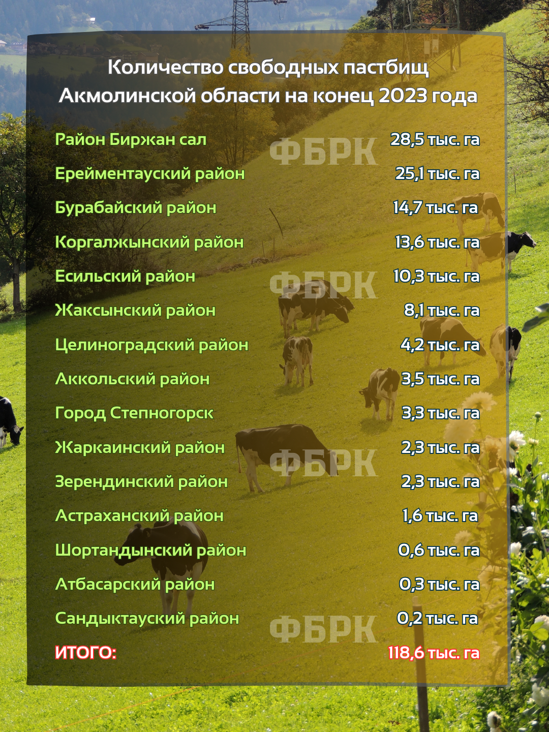 При этом, ведомство сообщает, что на сегодняшний день по области насчитывается 118,6 тыс. га свободных пастбищных угодий. Вероятно, разница в количестве свободных земель возникла в связи с передачей их в землепользование иным лицам.