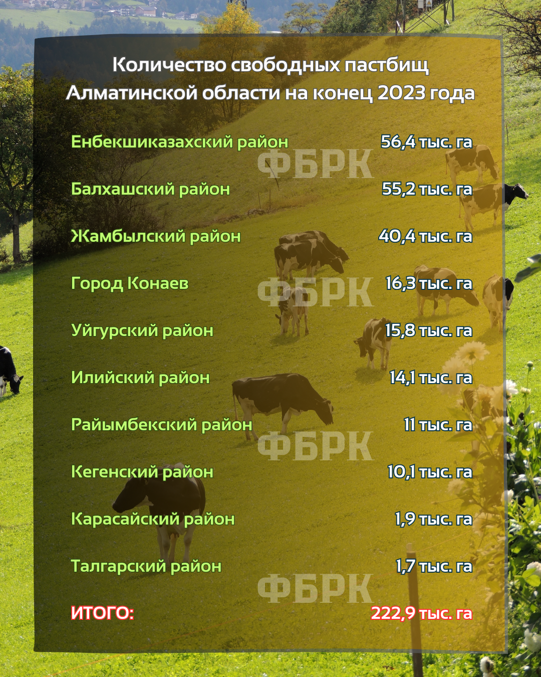 По данным Управления земельных отношений области Жетісу, площадь свободных пастбищ в регионе составляет 4533,8 тыс. га. Сообщается, до конца 2023 года был запланирован возврат 220 тыс. га сельхозземель, предоставленных с нарушением земельного законодательства.